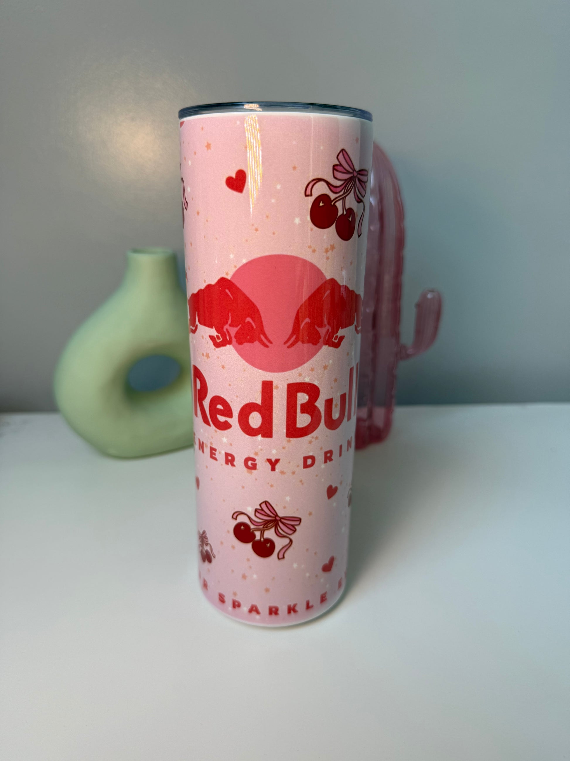 20oz thermal tumbler with a sublimated pink girlie cherries & bows redbull design that helps keep your drink at the desired temperature for longer due to its double walled design. This meaning hot drinks can stay hot for up to 6 hours and keep cold drinks cool for up to 12 hours.