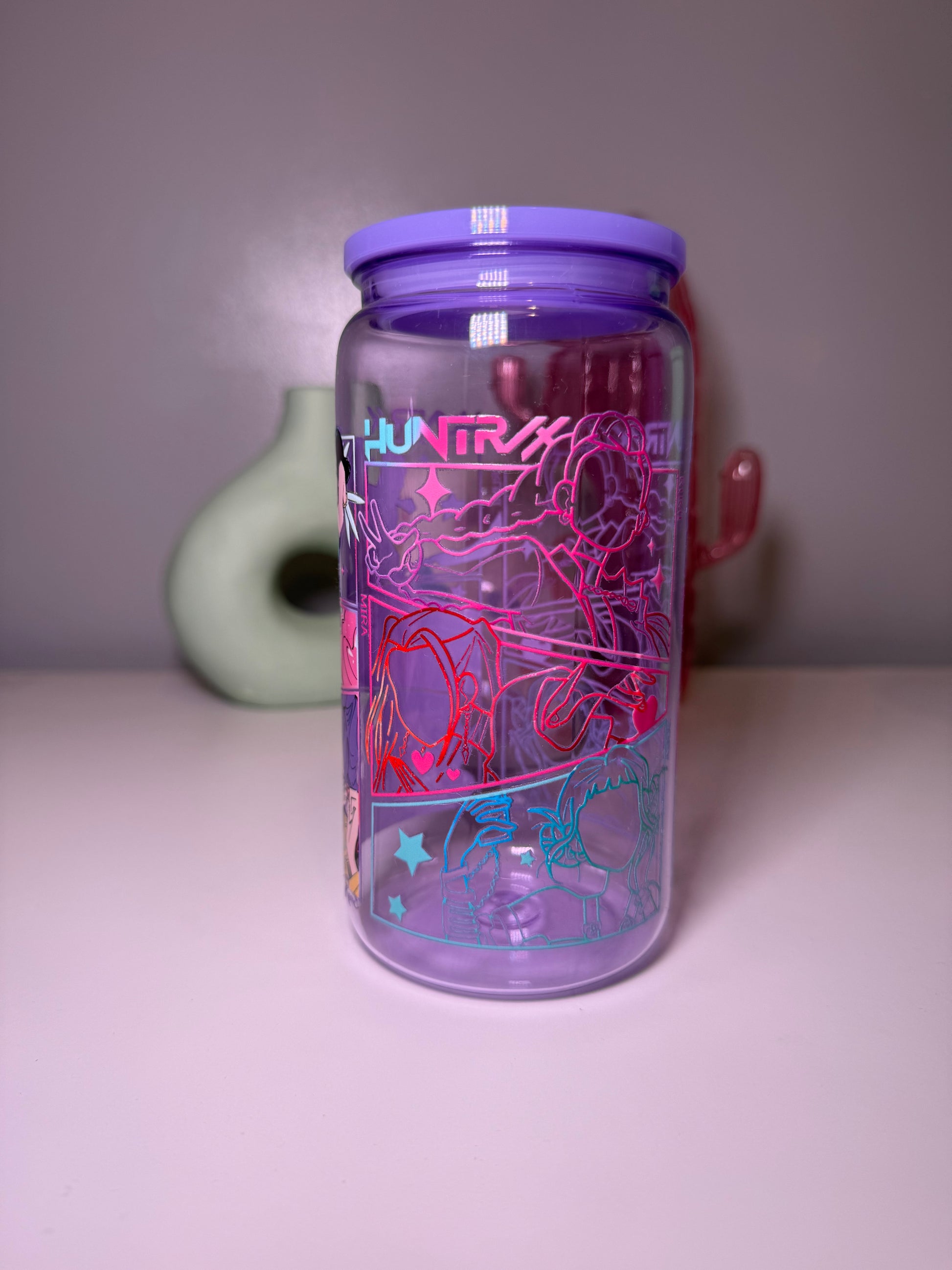 16oz purple plastic/acrylic libby can with K-Pop Demon Hunters HUNTR/X design. The perfect cup for all K-Pop Demon Hunters fans to enjoy their cold drinks. Each cup comes with a bamboo lid and reusable plastic straw.