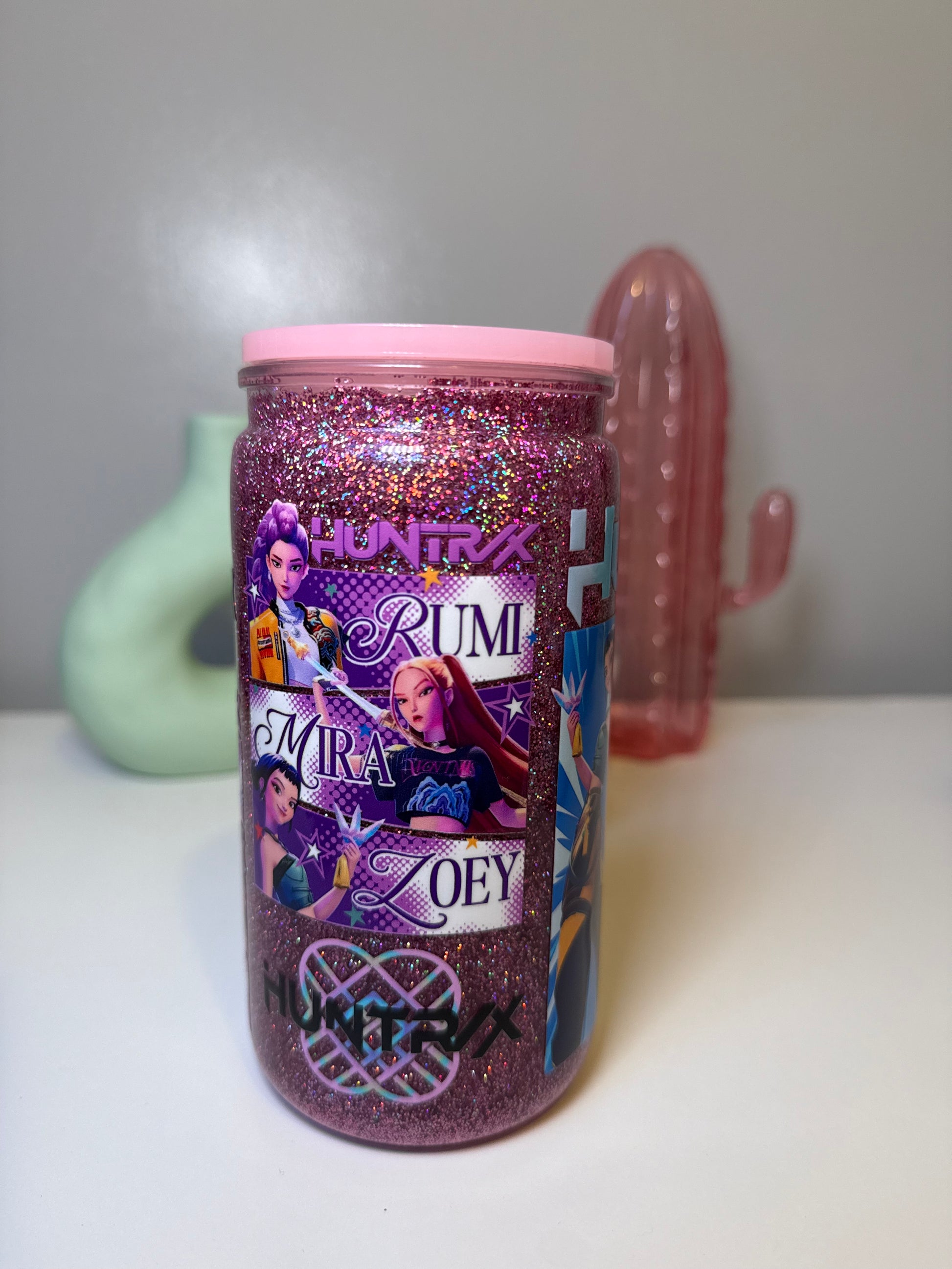 Holographic pink glitter snowglobe plastic cup with K-Pop Demon Hunters design.
