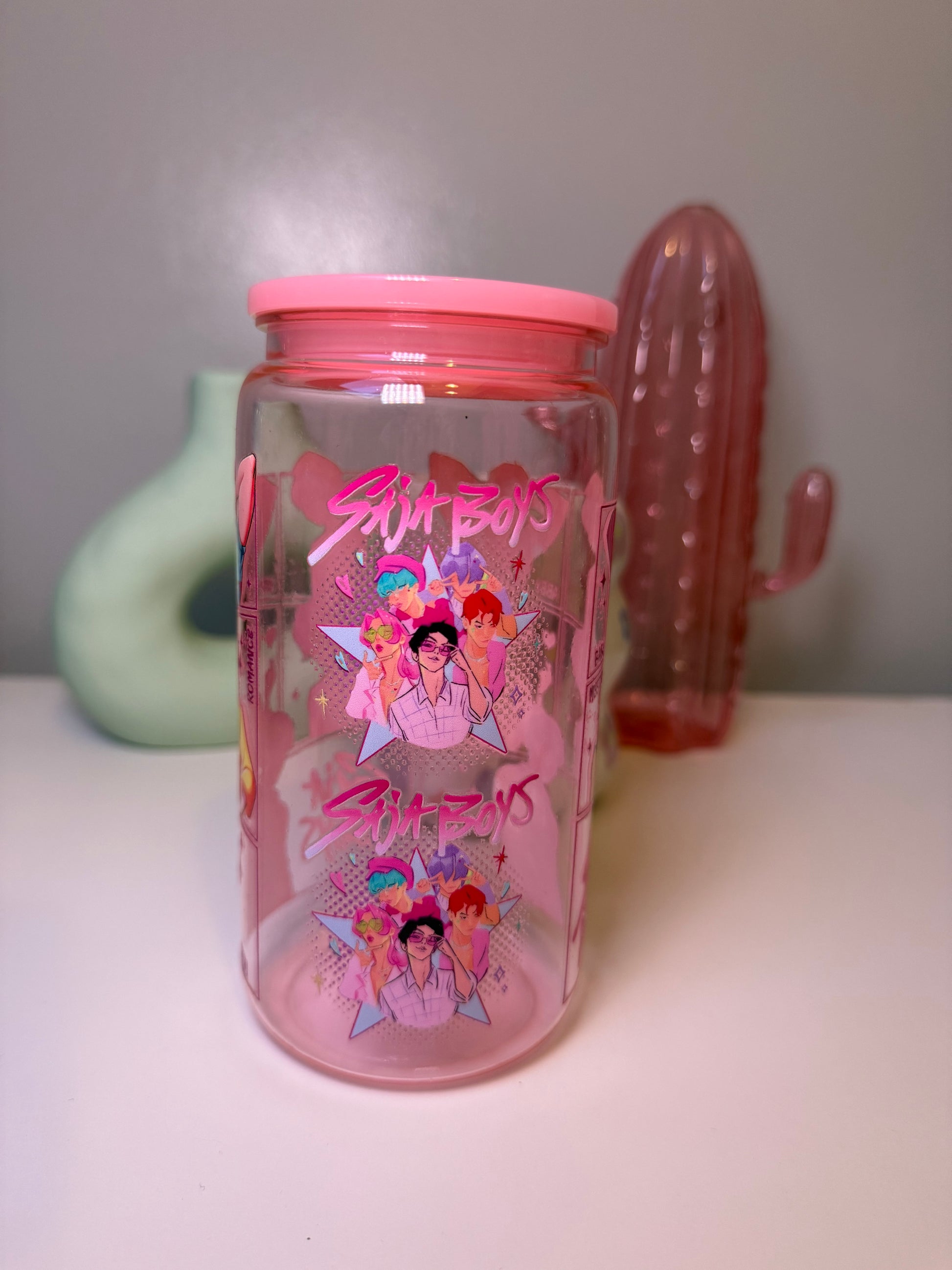 16oz pink plastic/acrylic libby can with K-Pop Demon Hunters Saja Boys design. The perfect cup for all K-Pop Demon Hunters fans to enjoy their cold drinks.